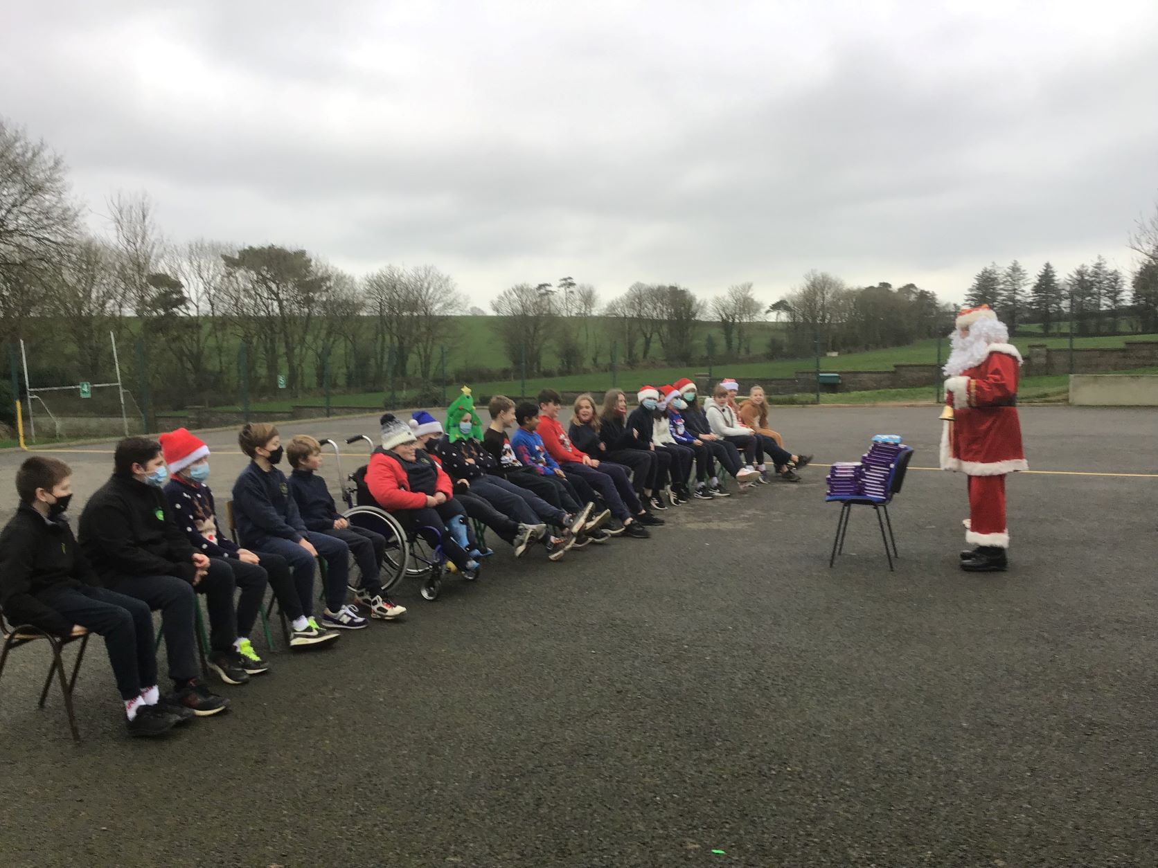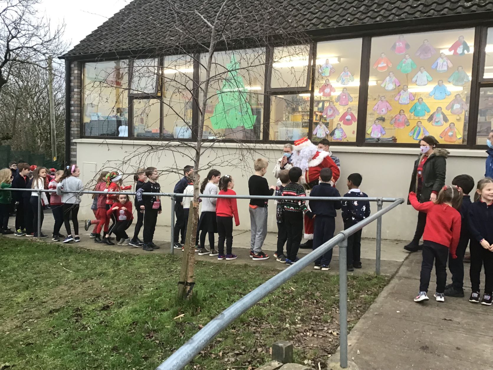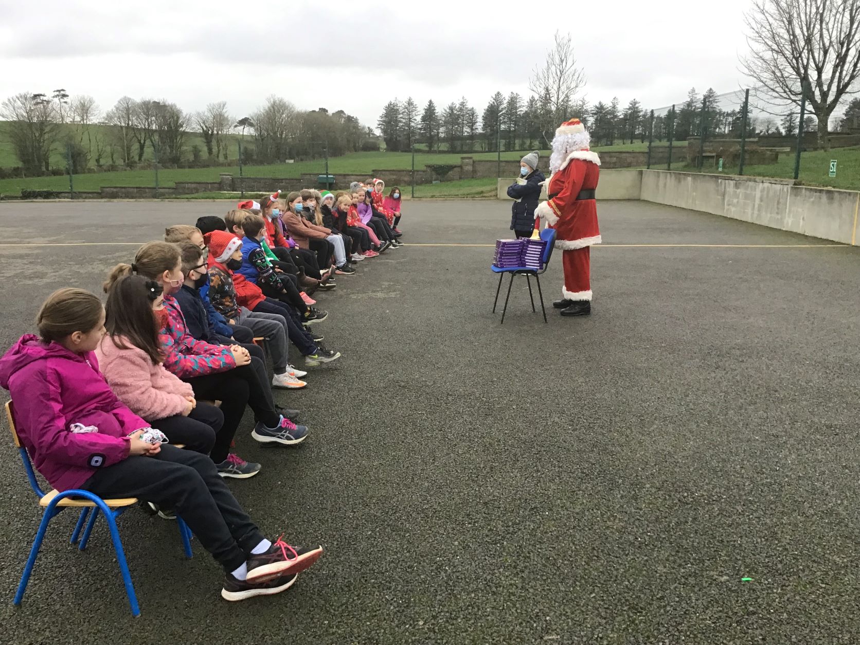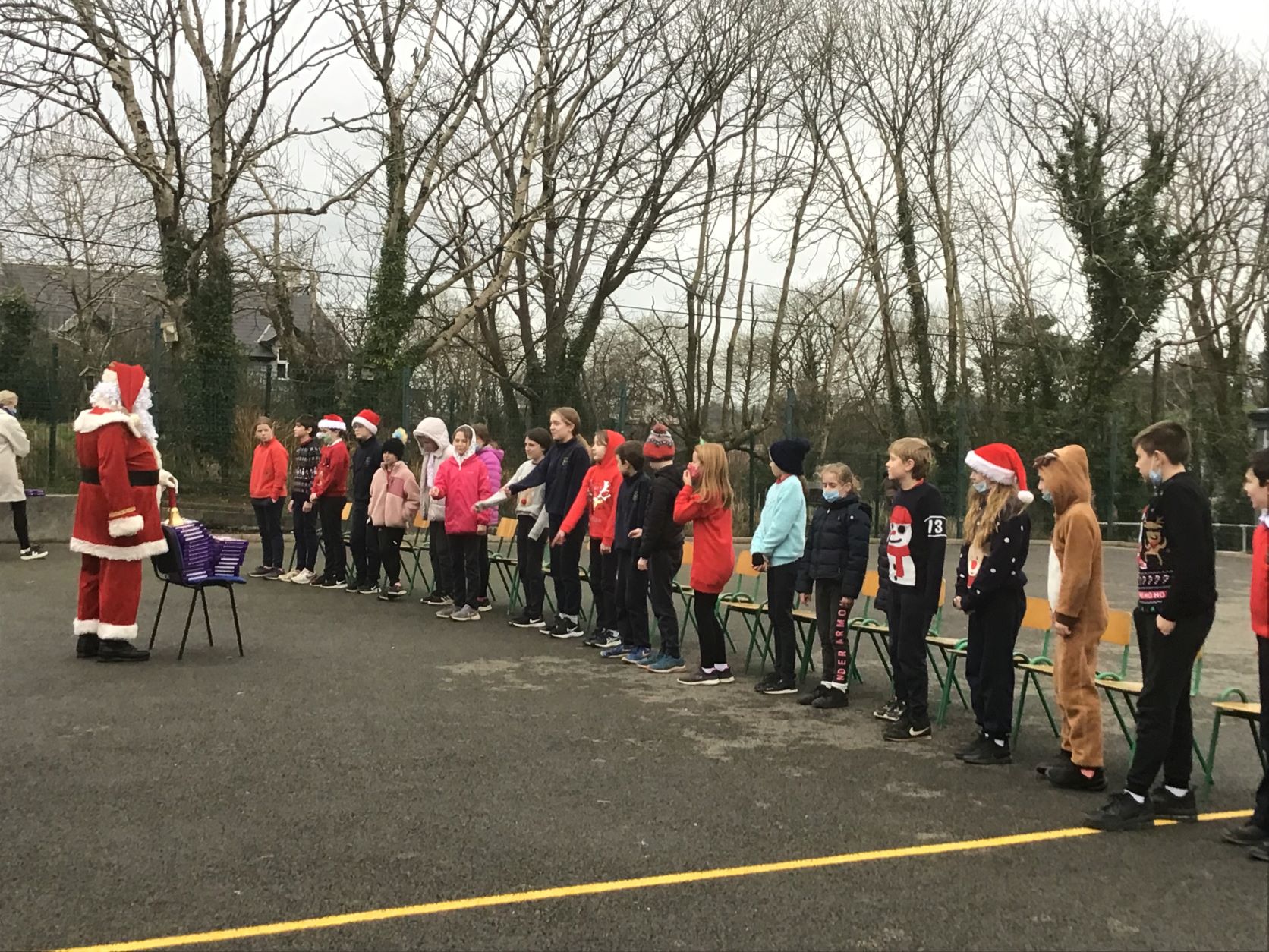 Santa came to visit us on Tuesday, December 22nd. A nice dry day so we could all see Santa in the school yard. The cold is no problem for Santa because he lives at the North Pole.