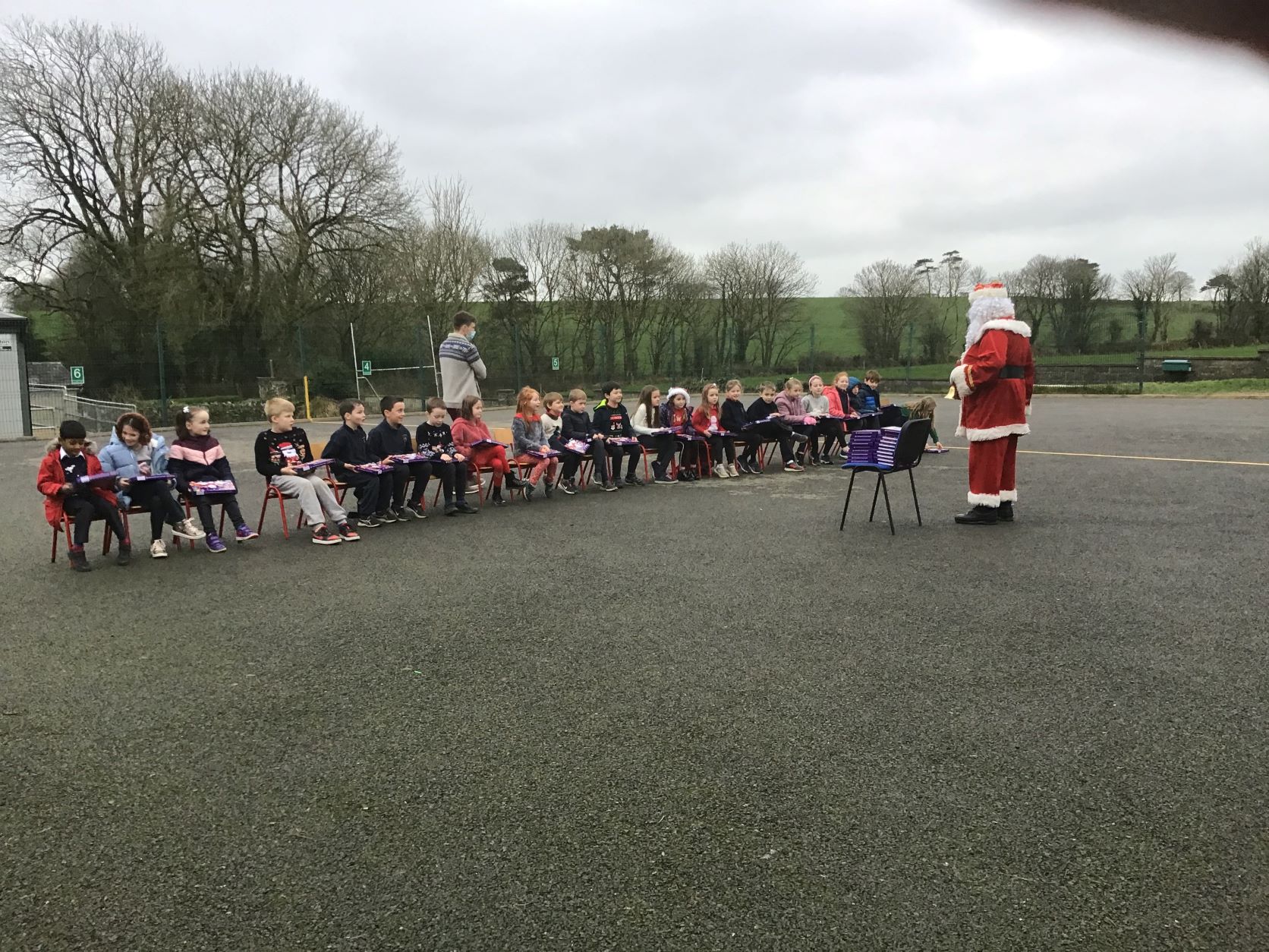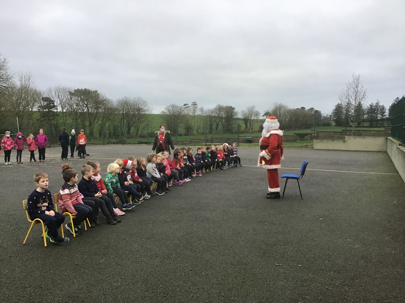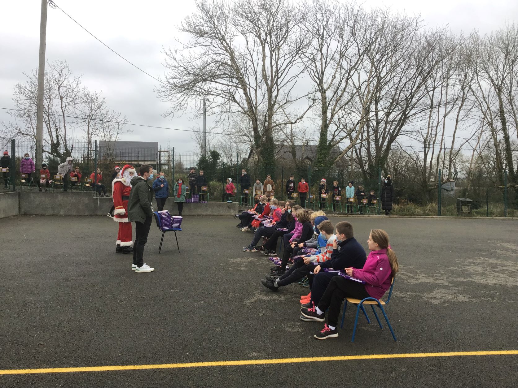 Santa came to visit us on Tuesday, December 22nd. A nice dry day so we could all see Santa in the school yard. The cold is no problem for Santa because he lives at the North Pole.