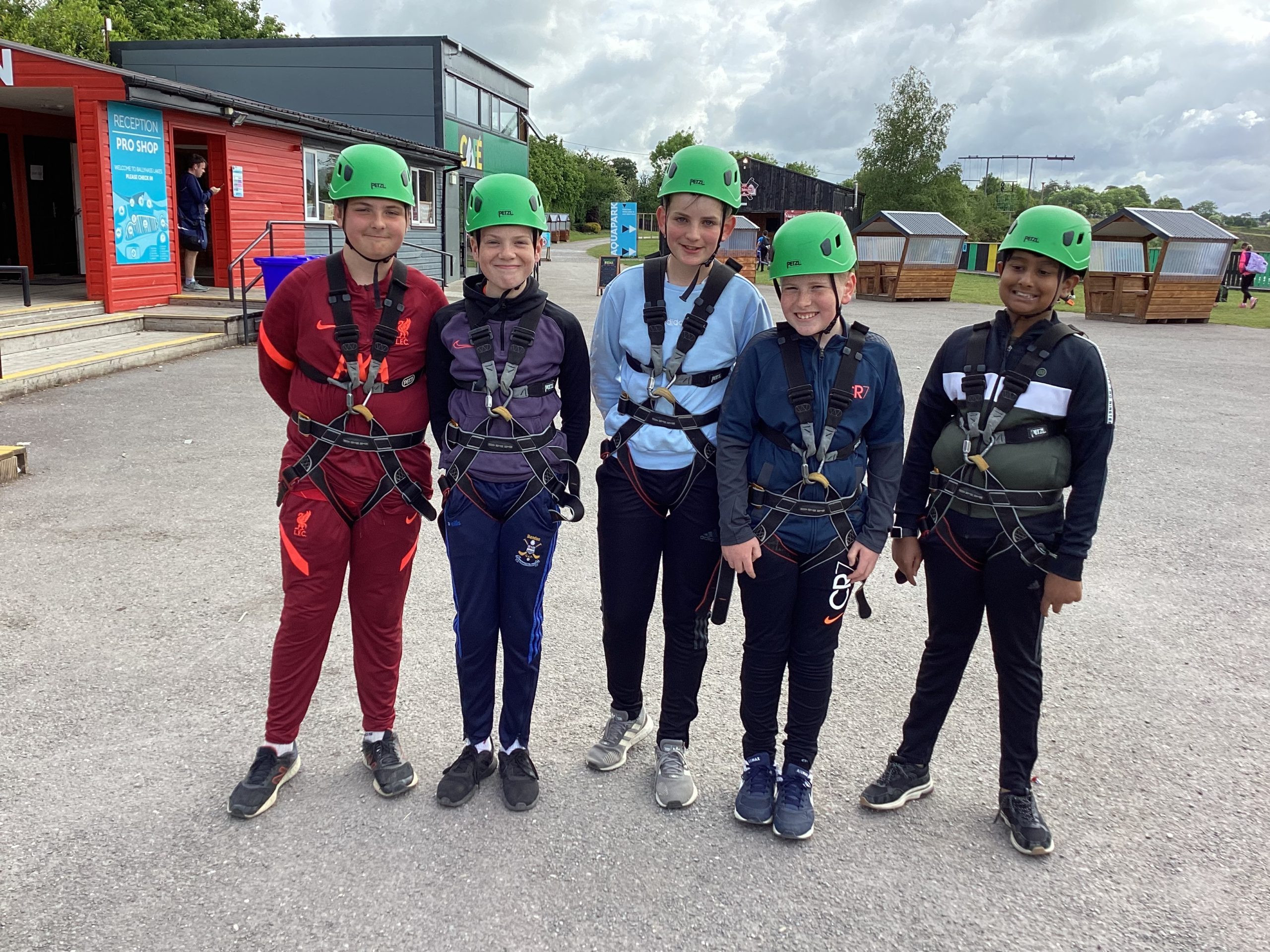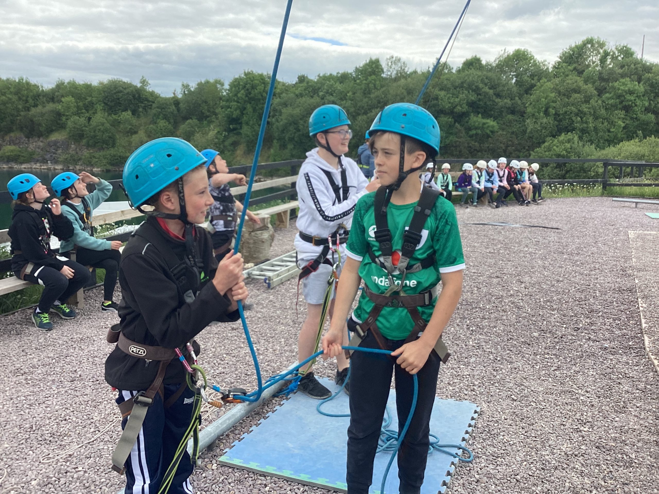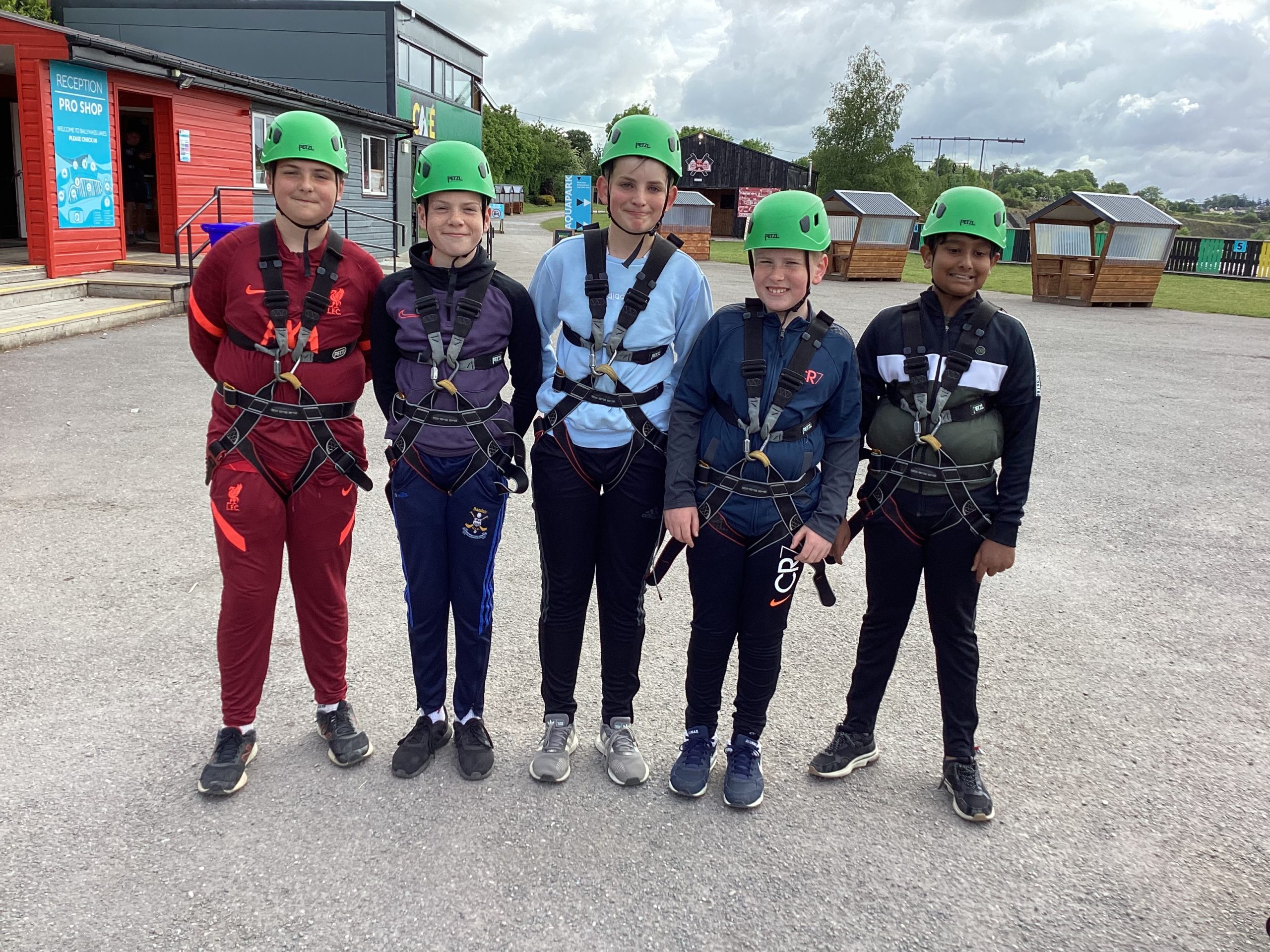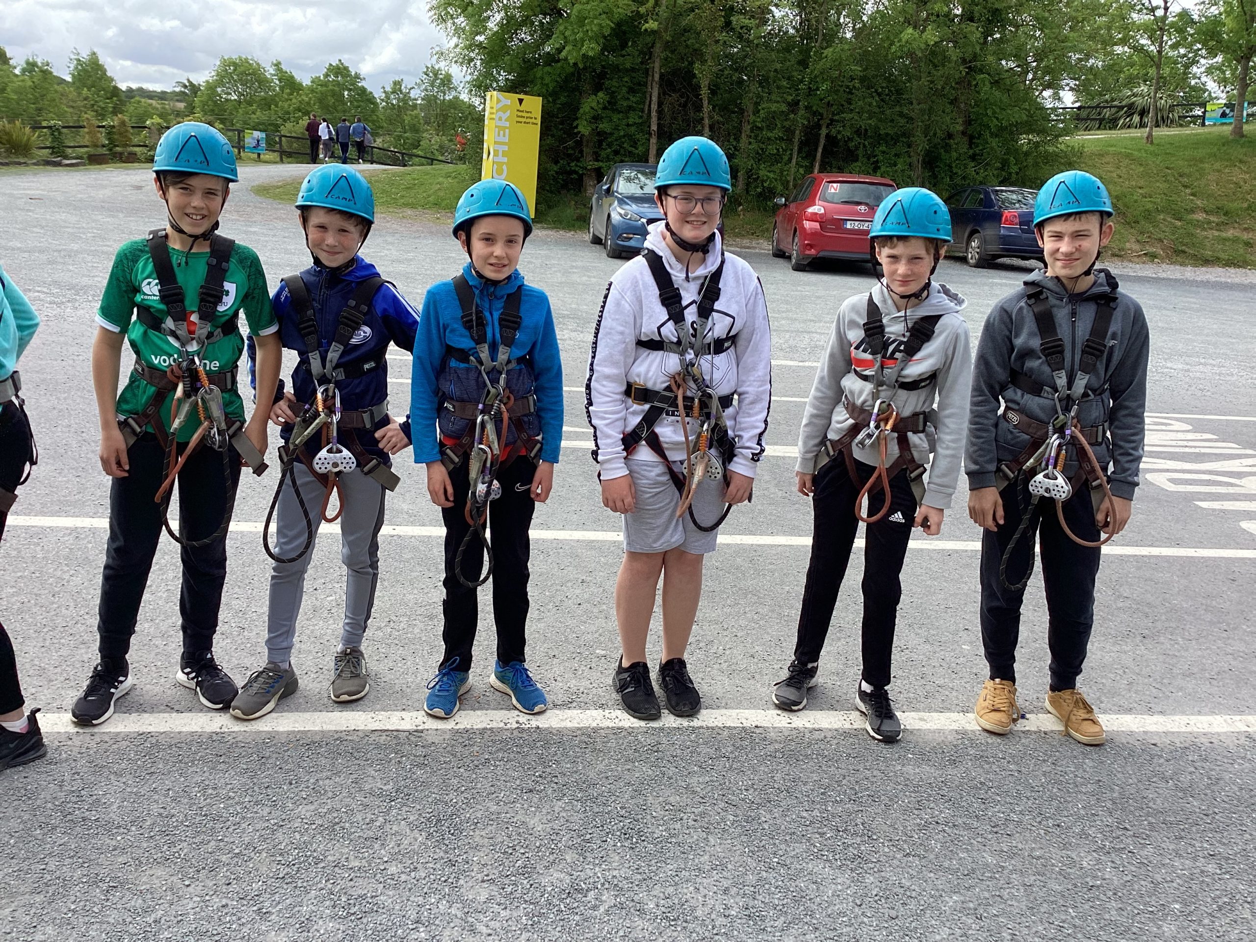 On the 30th of May, Fifth and Sixth class had their school tour in Ballyhass Adventure Sports Centre, Mallow. We left Laragh at 7.30am on a double decker bus and arrived at around 9.15 am. When we got out, we put our bags away into lockers and were separated into three groups. I was put into Group 1. We went to put on helmets and harnesses, then made our way to the big zip line that went across the lake!!