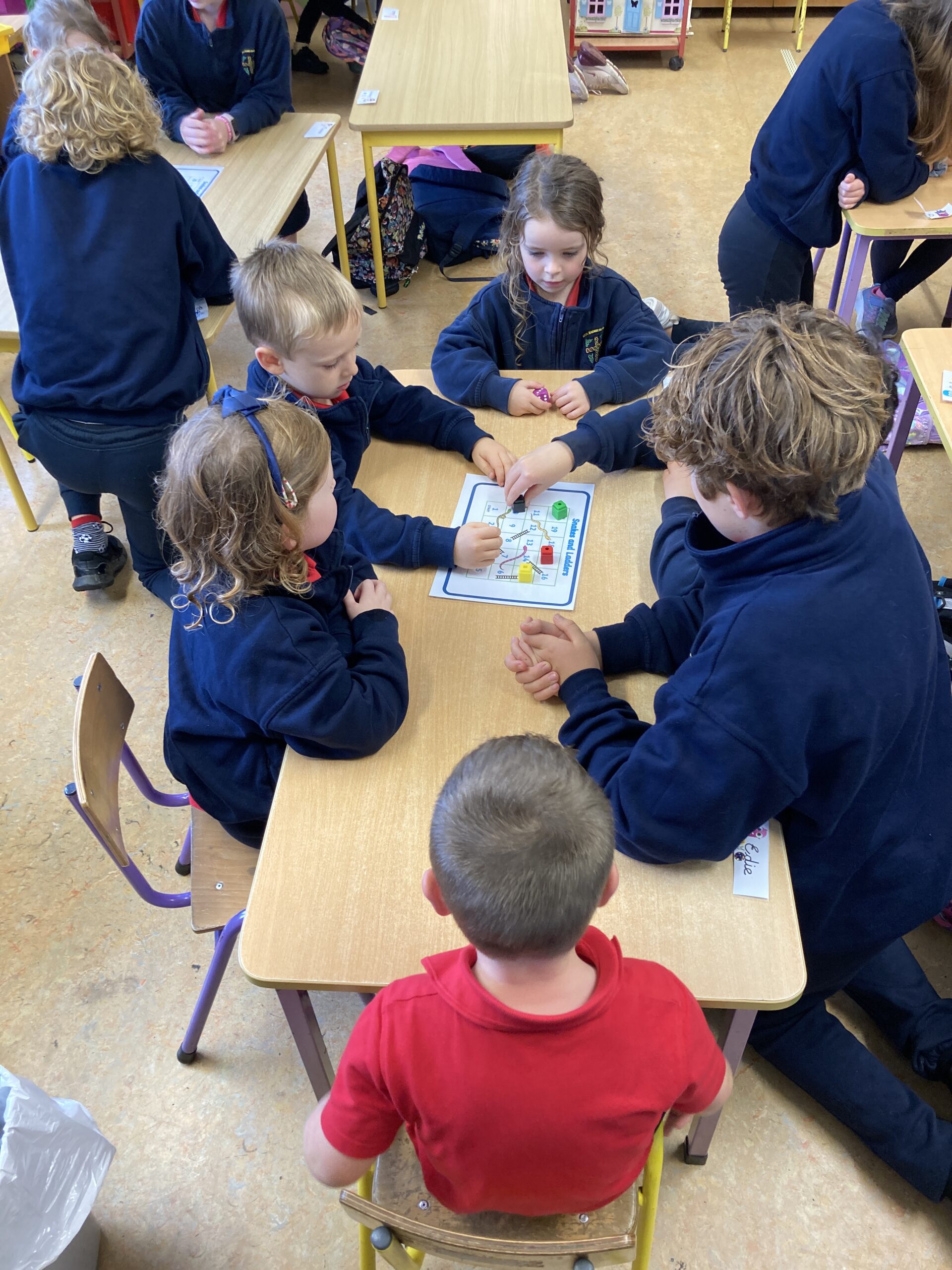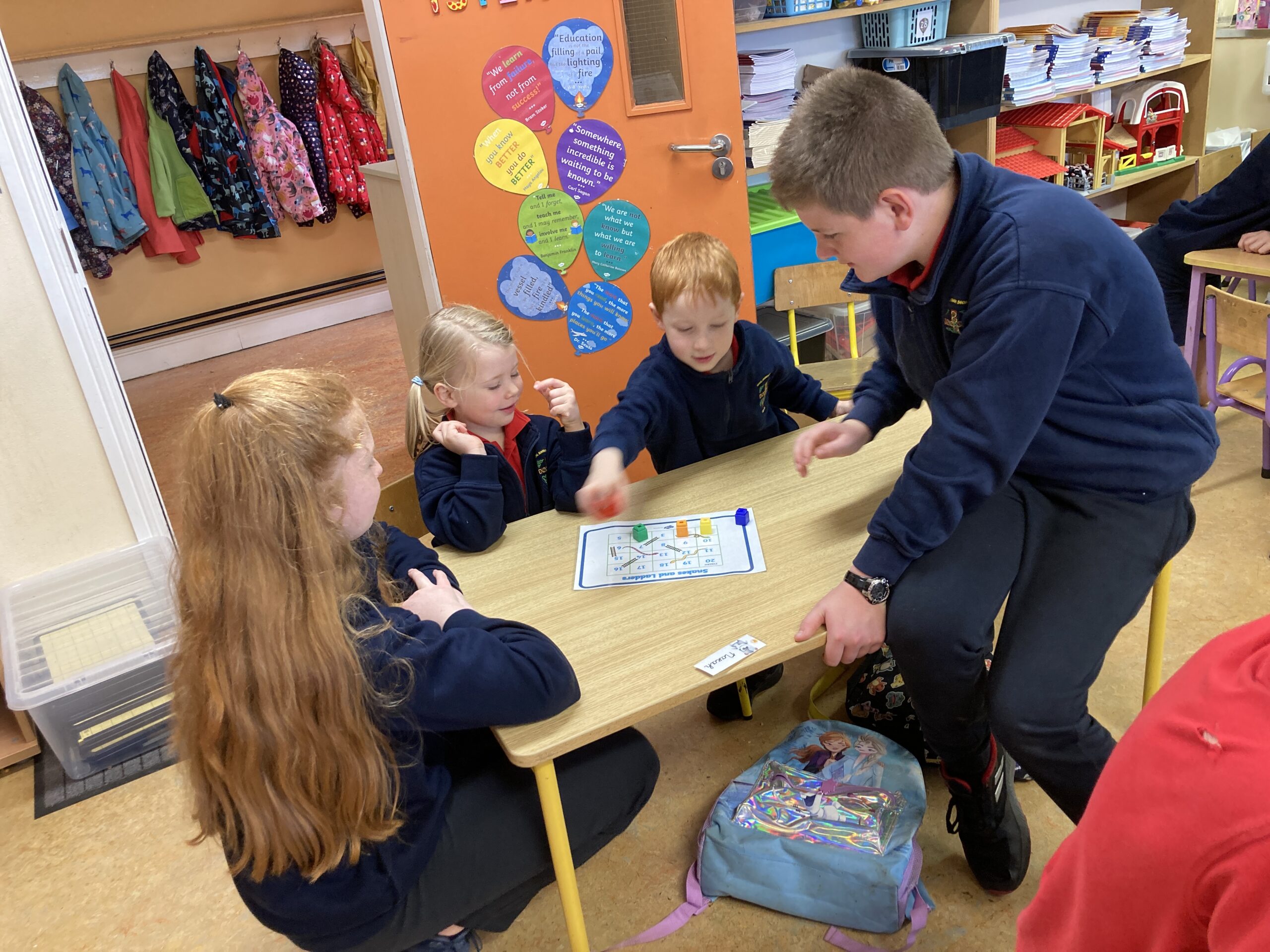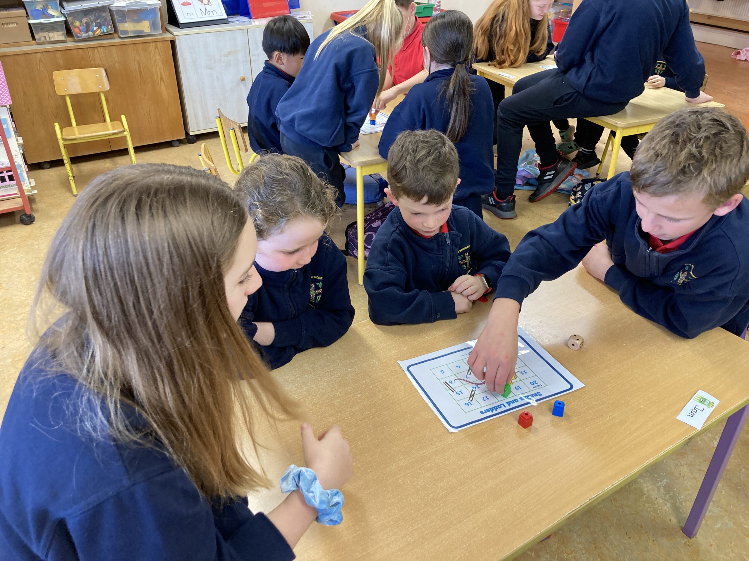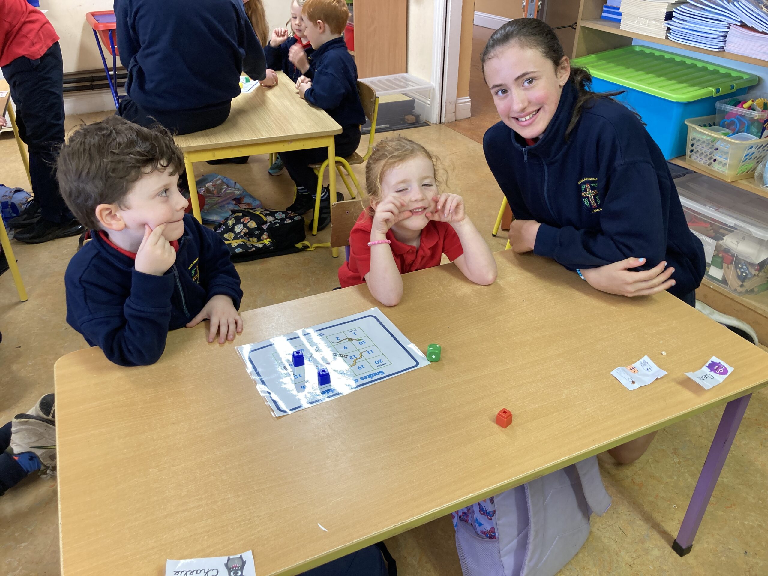 During Maths Weeks our Sixth Class Buddies came to play Snakes and Ladders with us. Playing games like this teach us important skills such as number order, counting forward and backwards, turn taking and being good winners and good losers. Thank you Rang a Sé for coming to play with us.