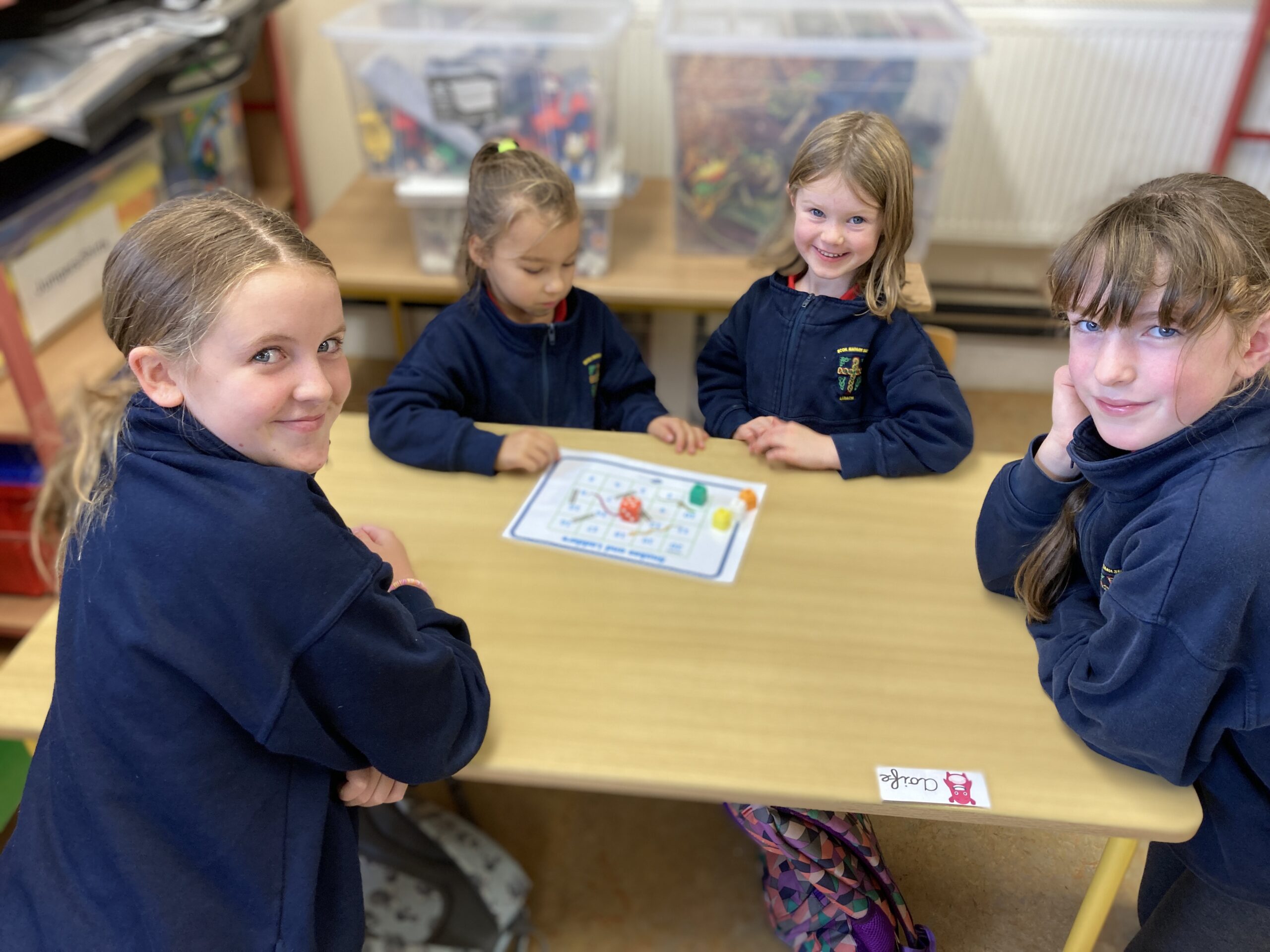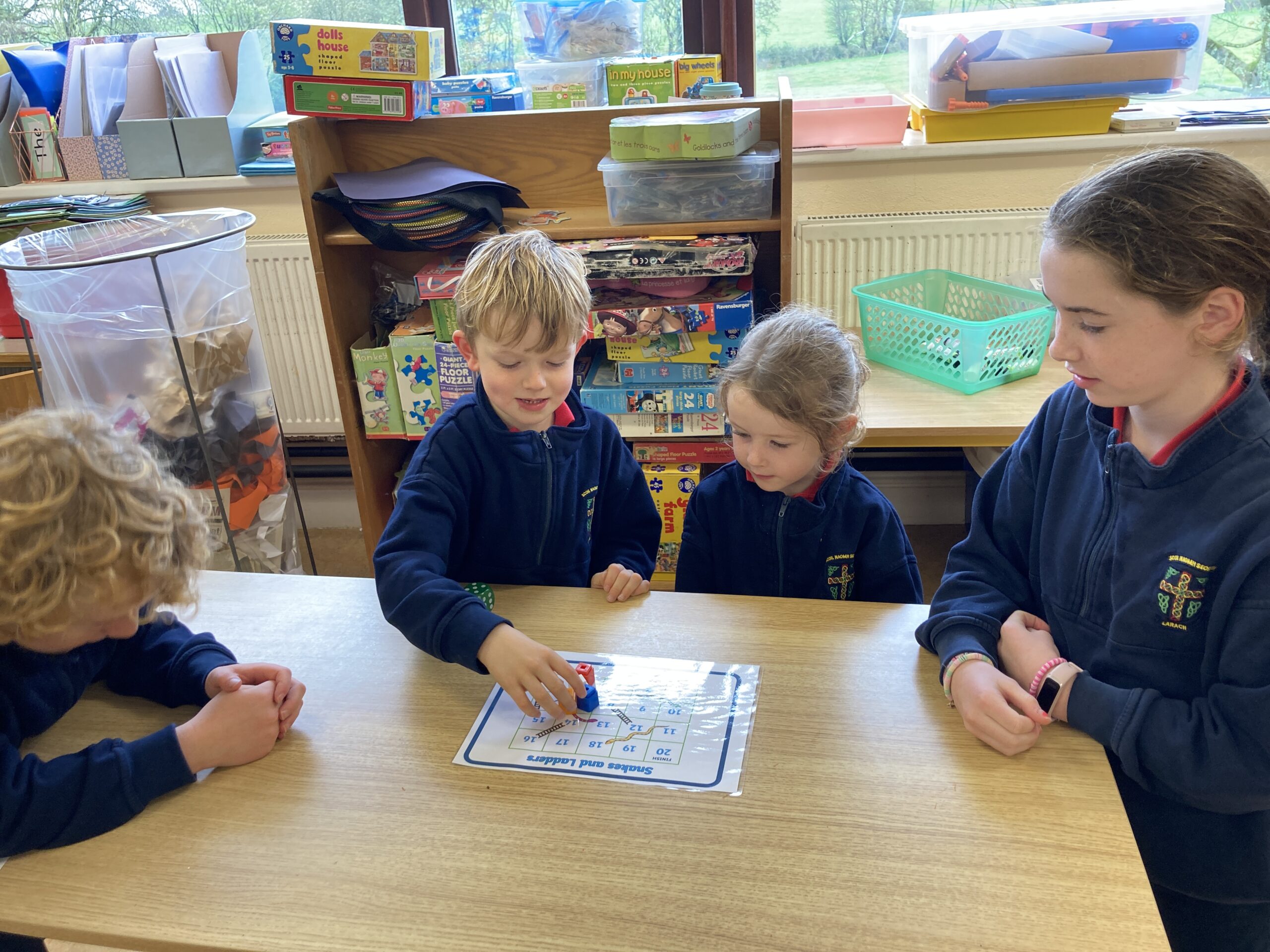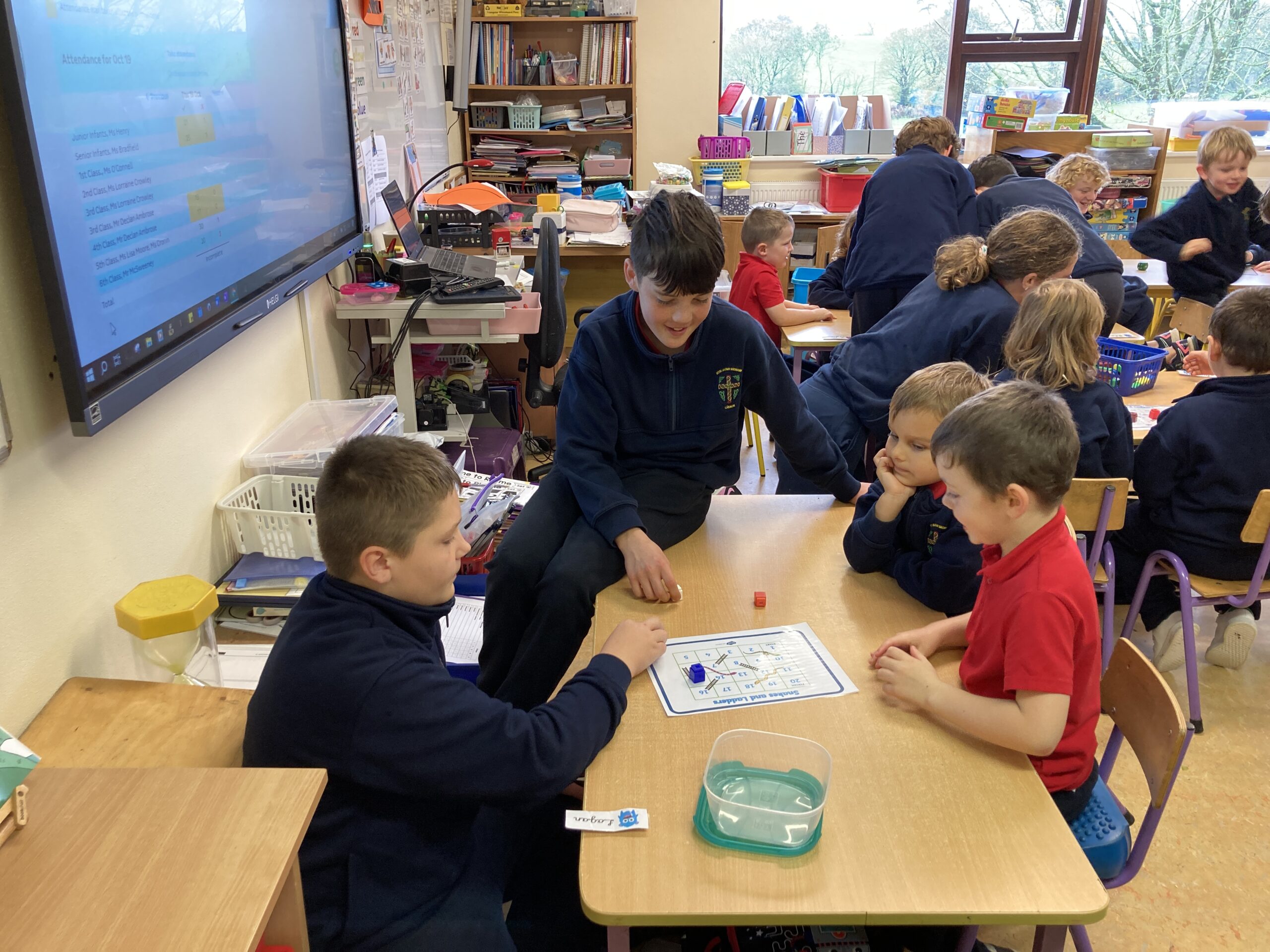 During Maths Weeks our Sixth Class Buddies came to play Snakes and Ladders with us. Playing games like this teach us important skills such as number order, counting forward and backwards, turn taking and being good winners and good losers. Thank you Rang a Sé for coming to play with us.