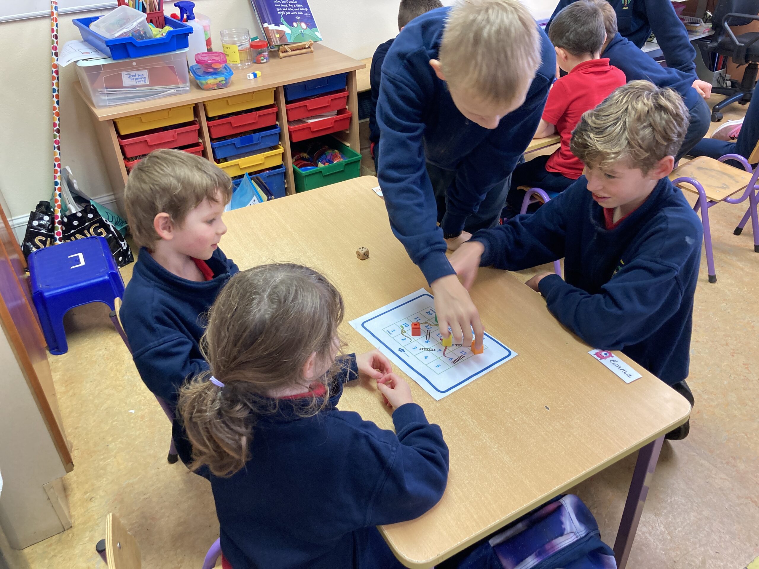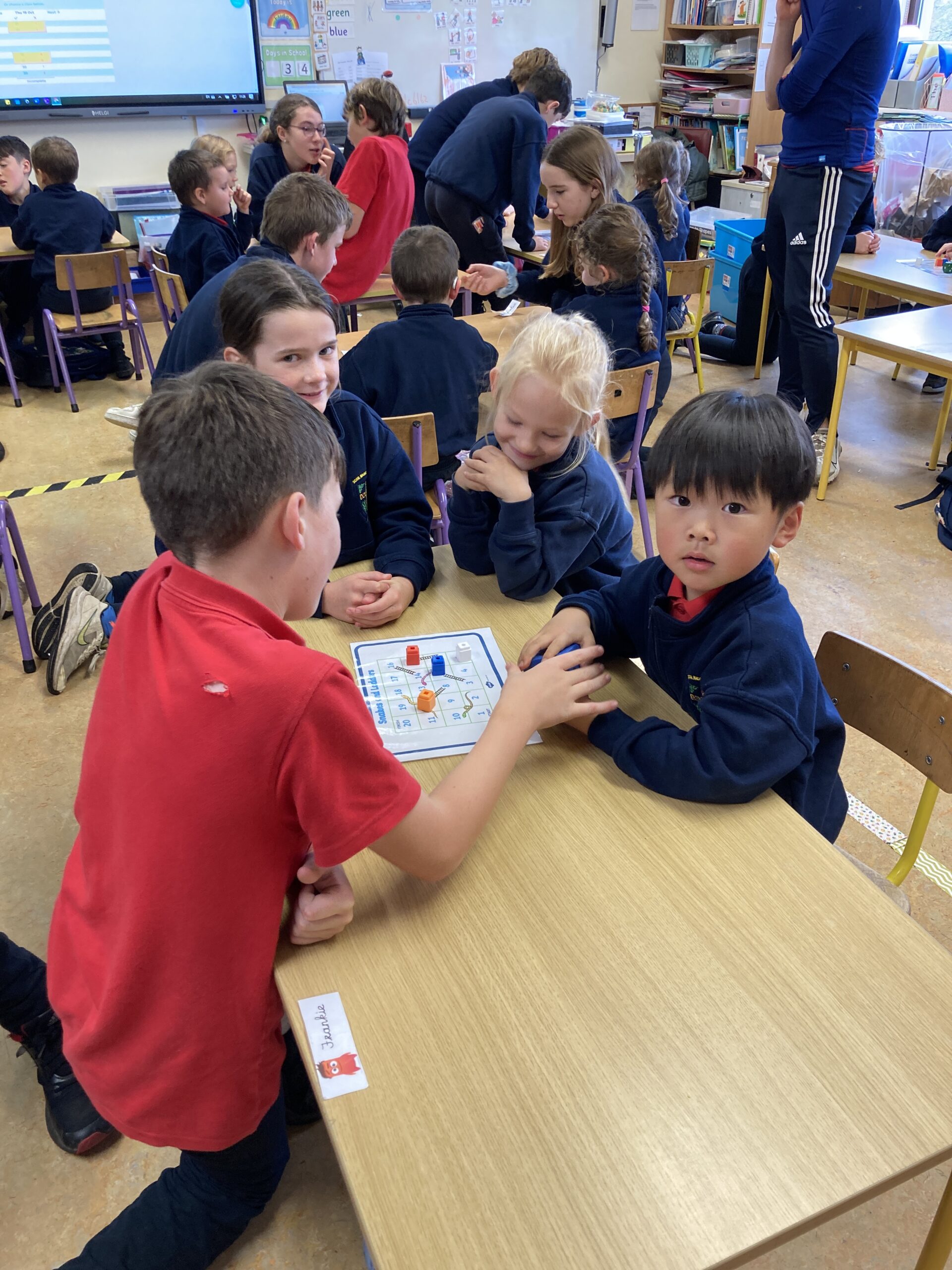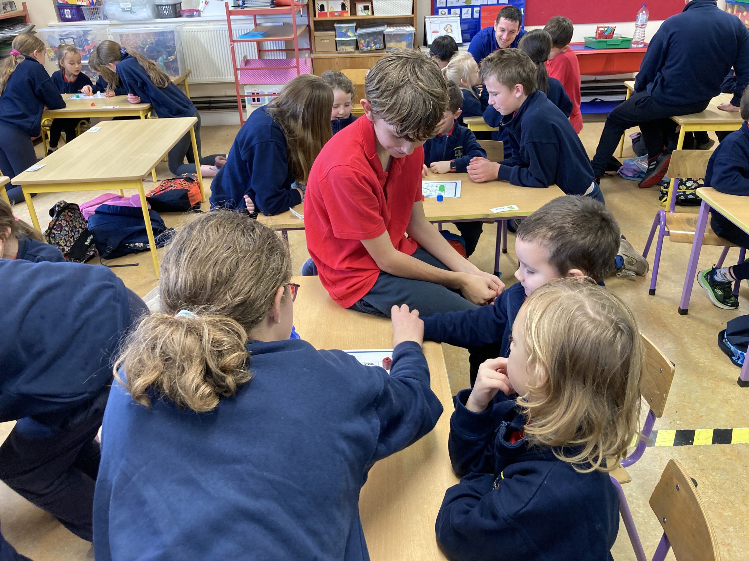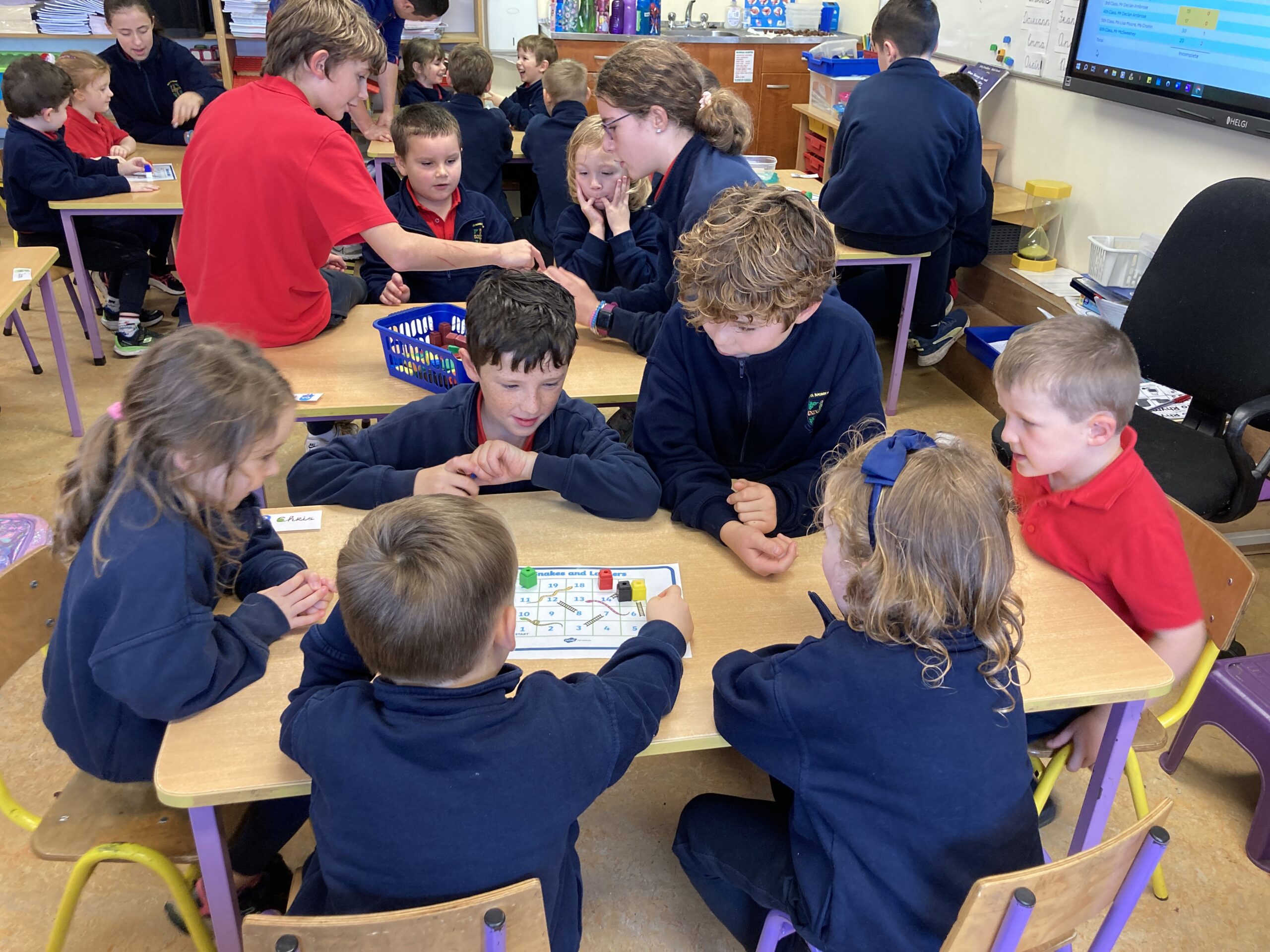 During Maths Weeks our Sixth Class Buddies came to play Snakes and Ladders with us. Playing games like this teach us important skills such as number order, counting forward and backwards, turn taking and being good winners and good losers. Thank you Rang a Sé for coming to play with us.