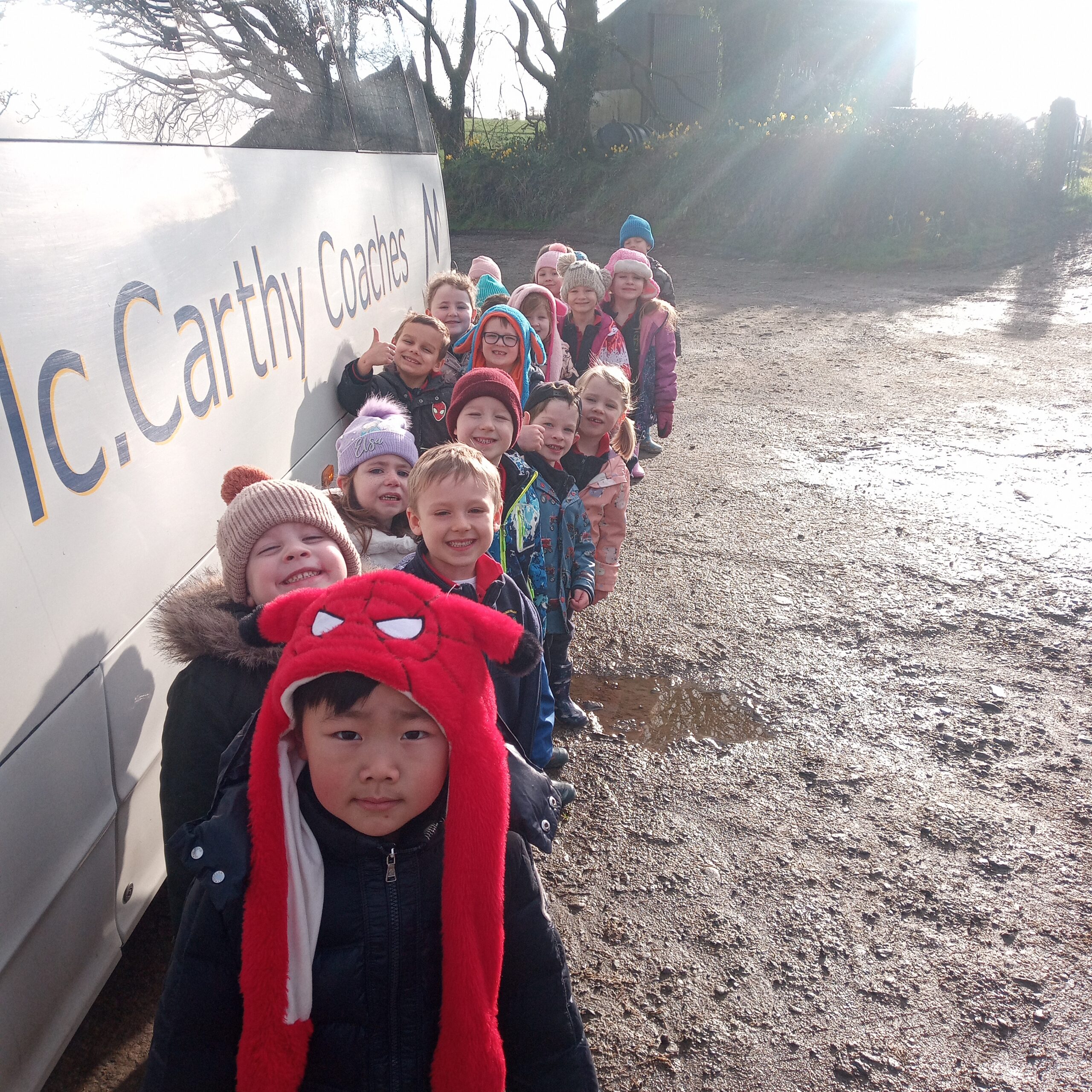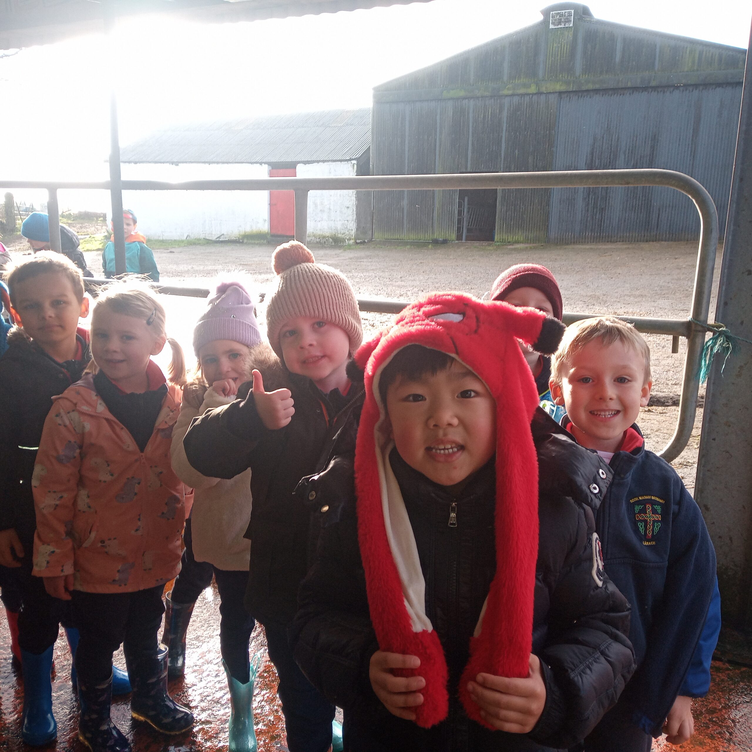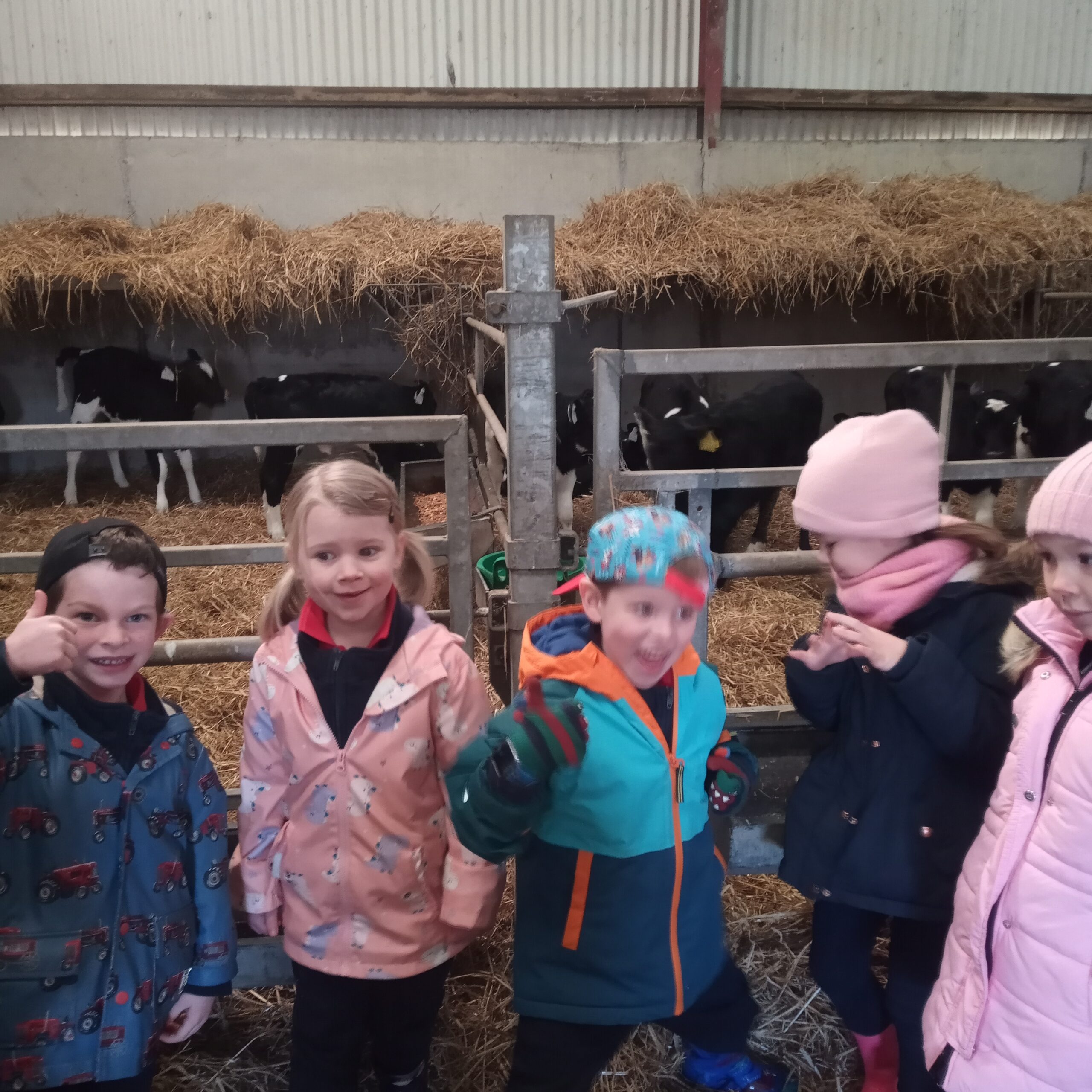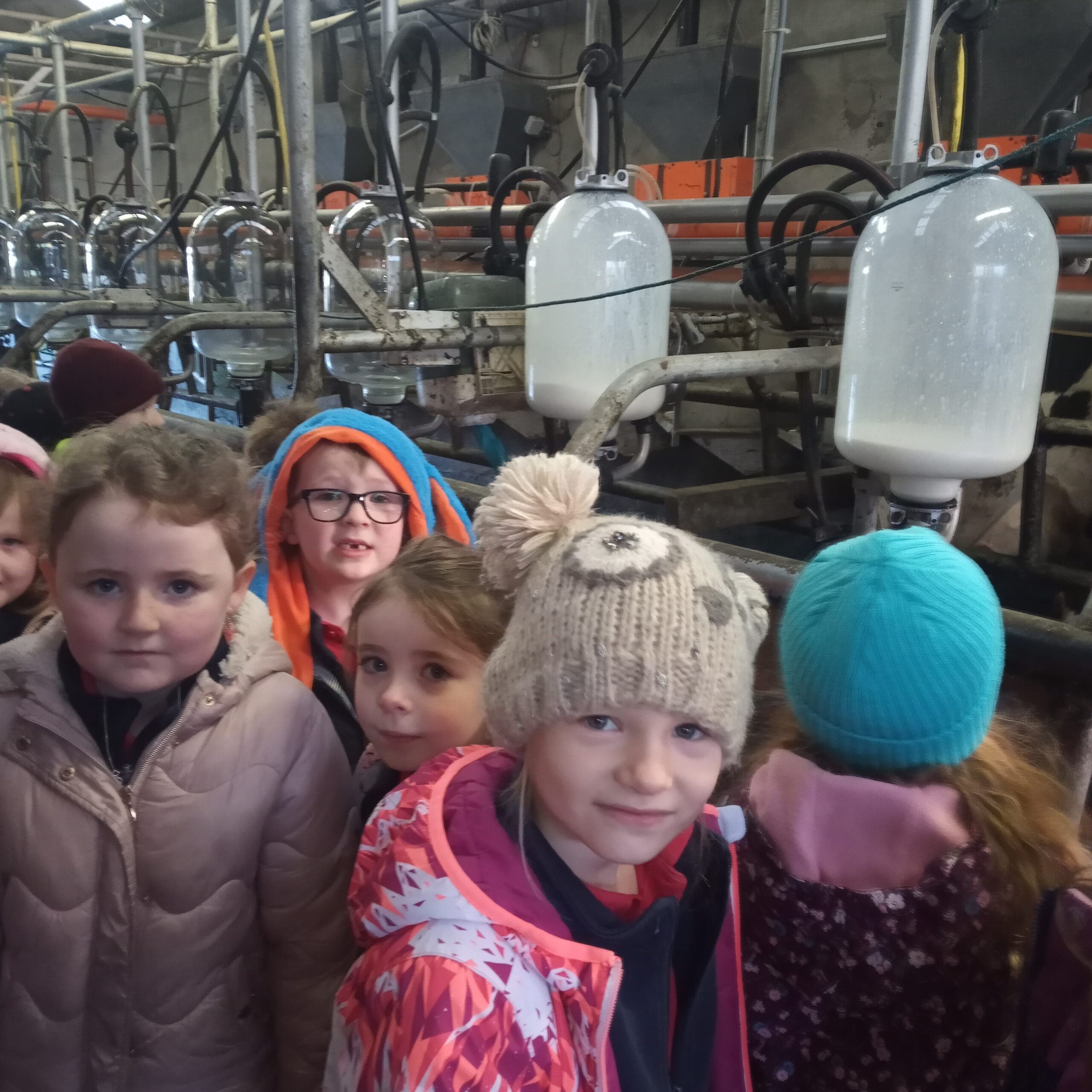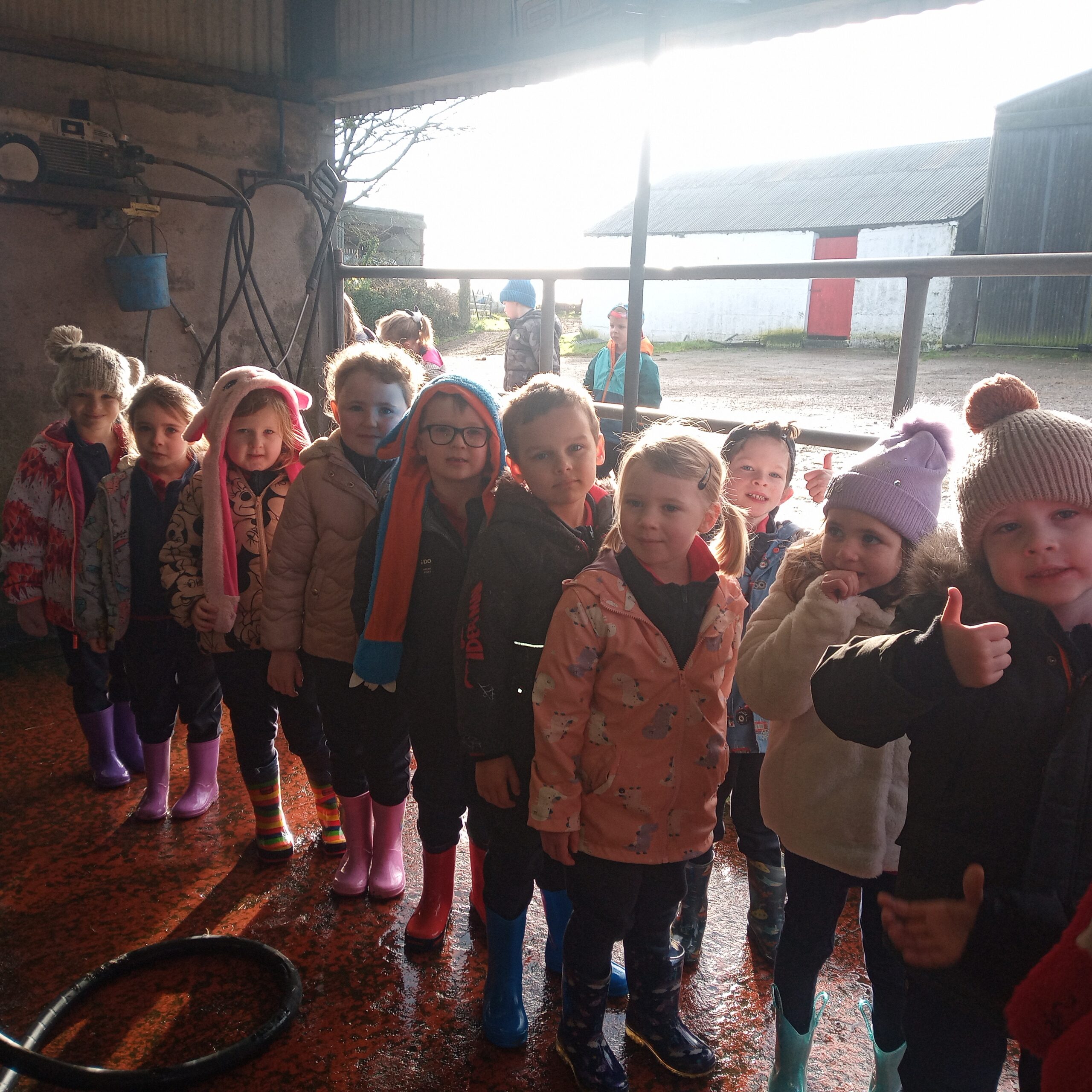 On Wednesday 16th February, Junior Infants went to visit John Canty’s farm. We were very excited to put on our wellies and head off on the bus. When we got to the farm the first thing we did was to wash our wellies before we went into the milking parlour. There we saw three cows being milked. Next we headed over to the calves’ shed where everyone had a turn at feeding the baby calves milk from a bucket. After that we went to the shed where the calves are born. We saw a very new calf, only a few hours old. Finally we cleaned our wellies before we got back on the bus to take us back to school. Everyone got a lovely wooly hat as a souvenier of our trip to the farm.
