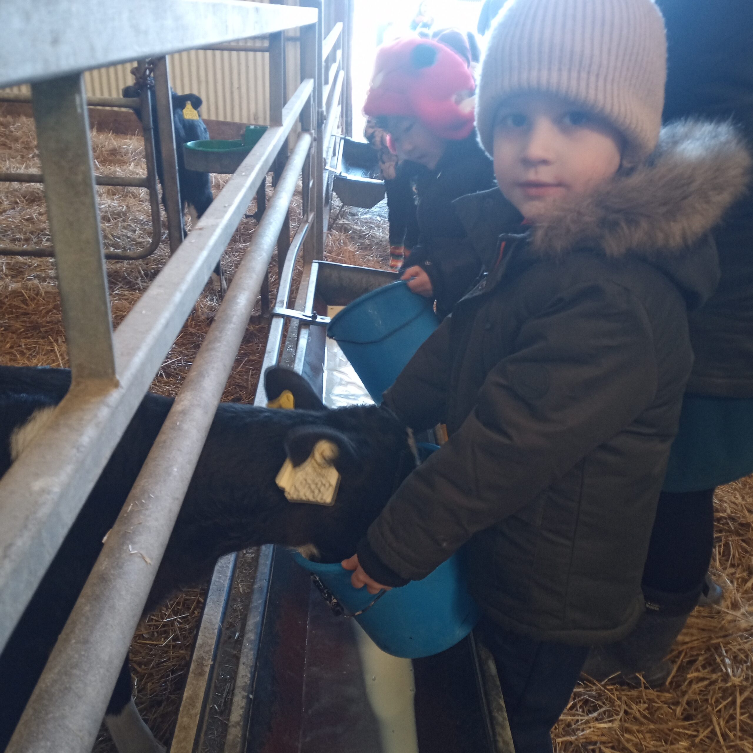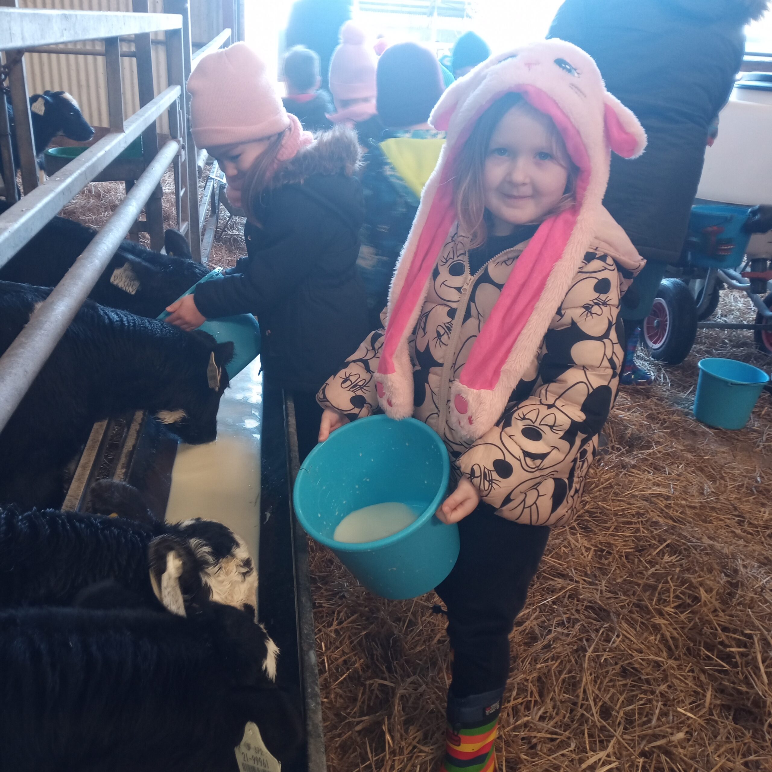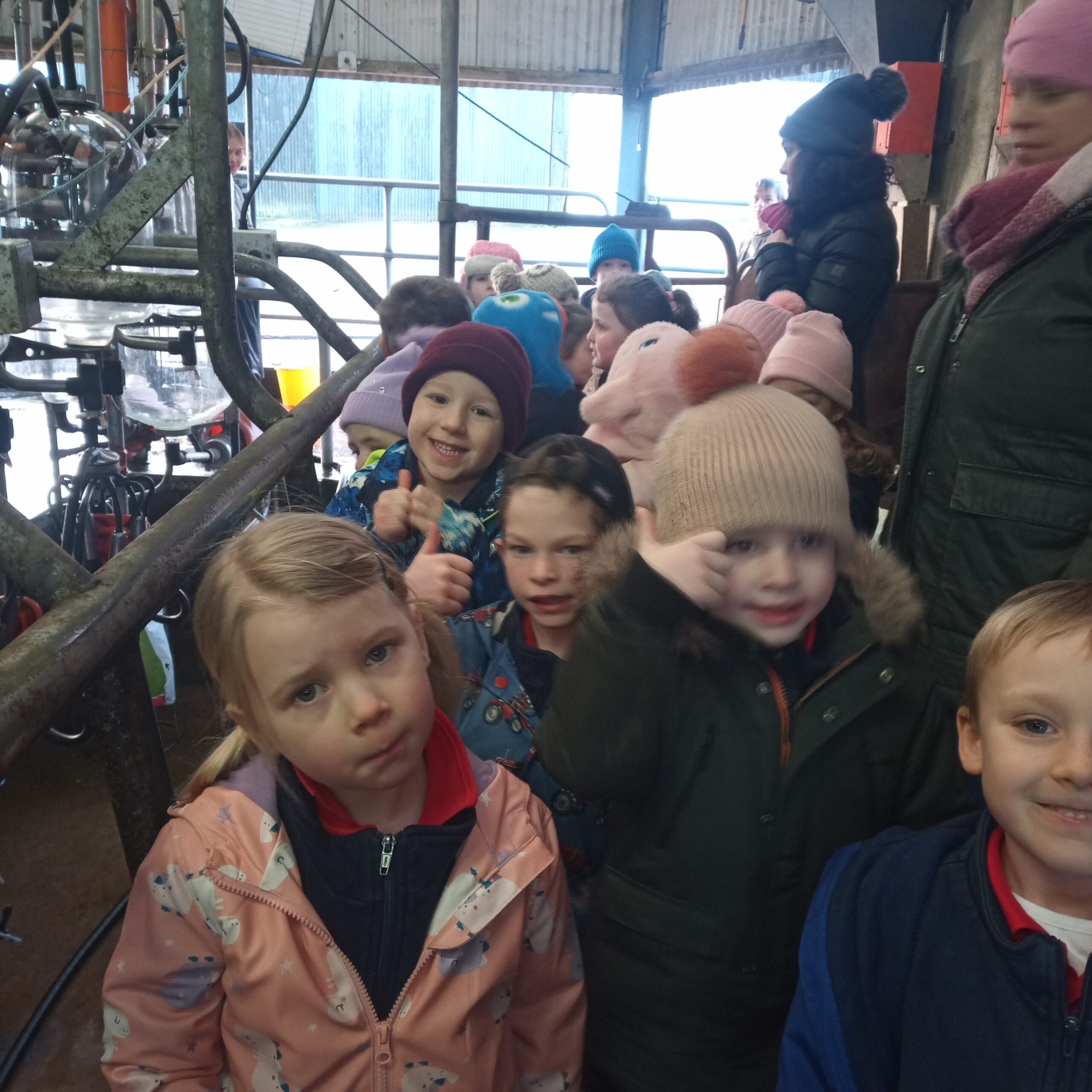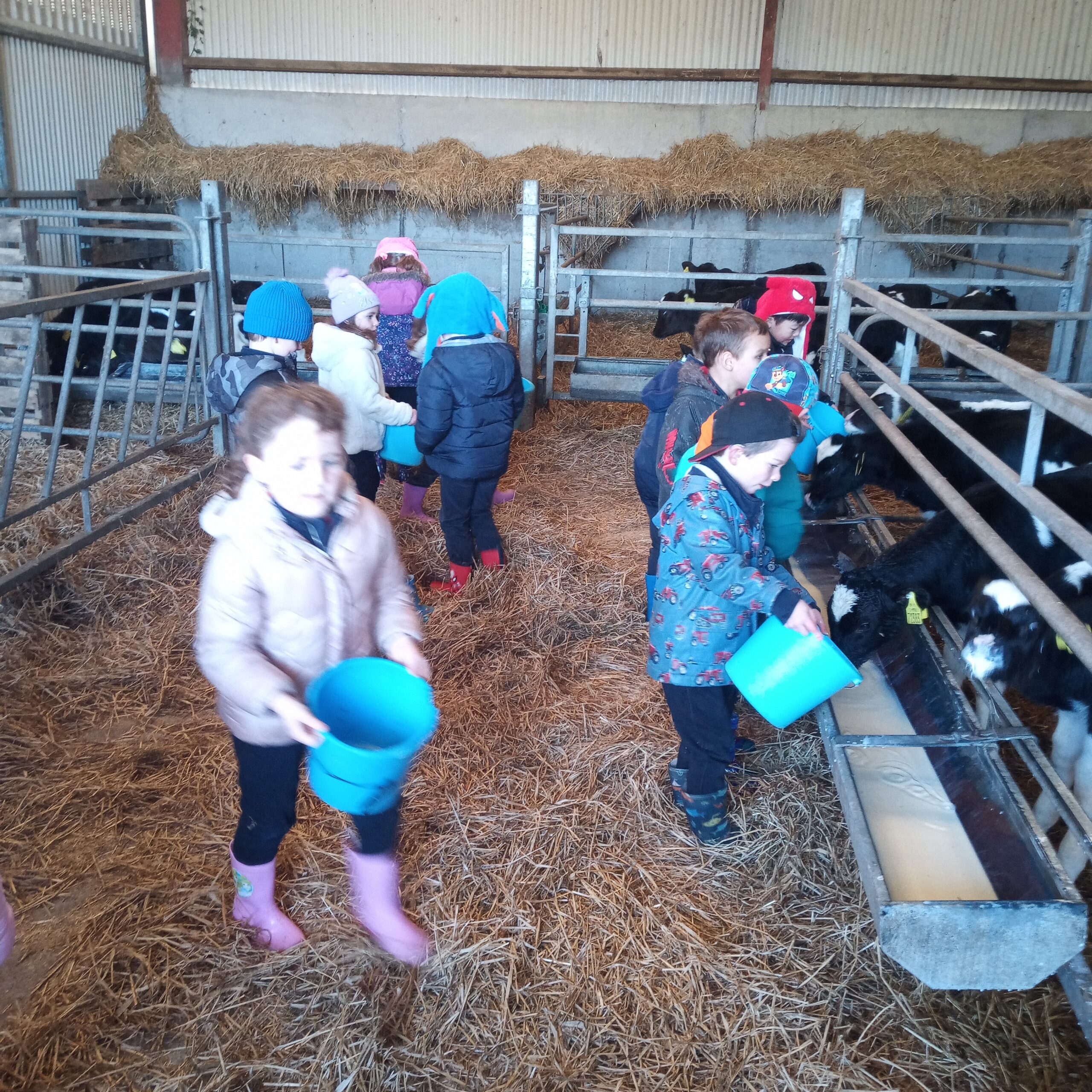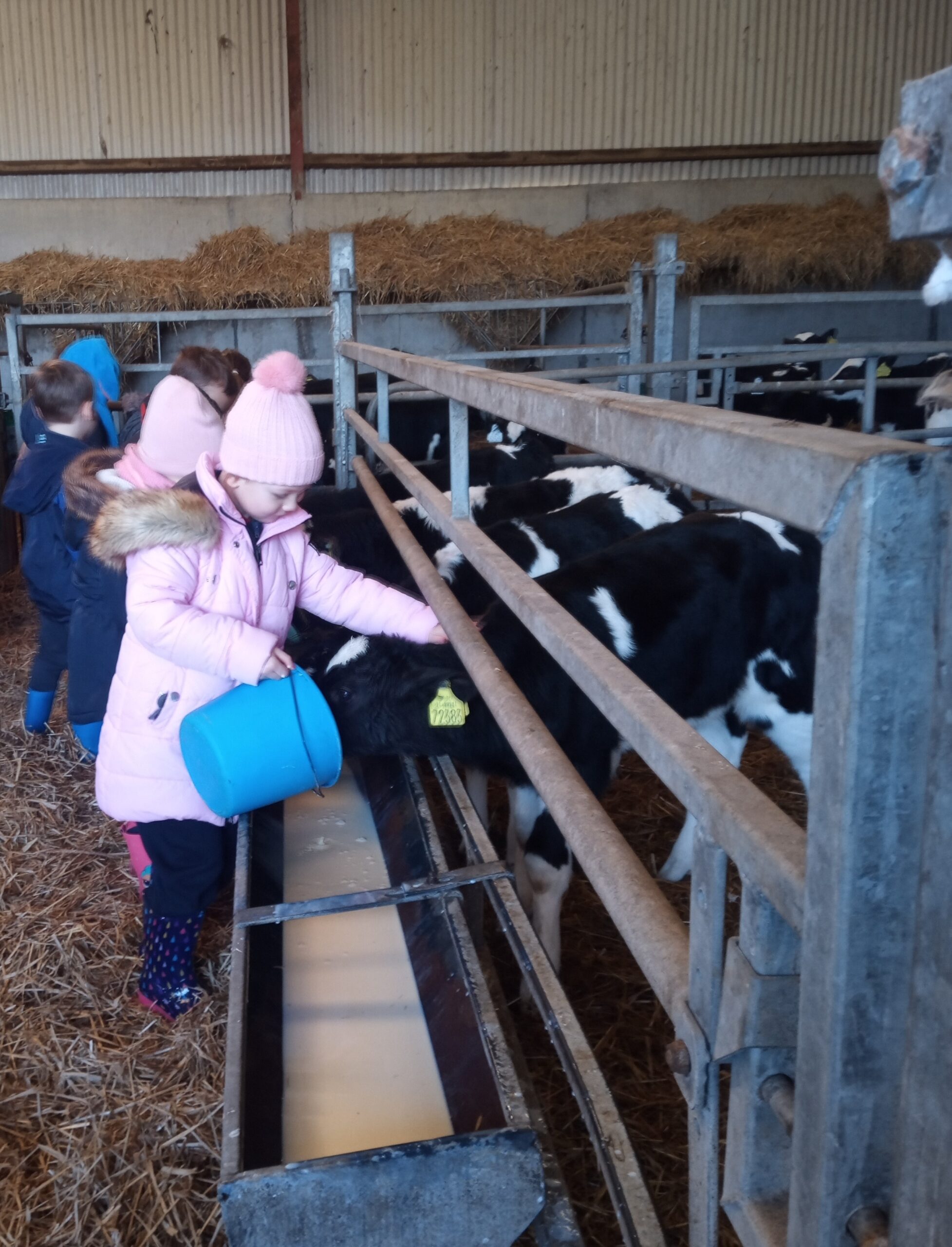 On Wednesday 16th February, Junior Infants went to visit John Canty’s farm. We were very excited to put on our wellies and head off on the bus. When we got to the farm the first thing we did was to wash our wellies before we went into the milking parlour. There we saw three cows being milked. Next we headed over to the calves’ shed where everyone had a turn at feeding the baby calves milk from a bucket. After that we went to the shed where the calves are born. We saw a very new calf, only a few hours old. Finally we cleaned our wellies before we got back on the bus to take us back to school. Everyone got a lovely wooly hat as a souvenier of our trip to the farm.